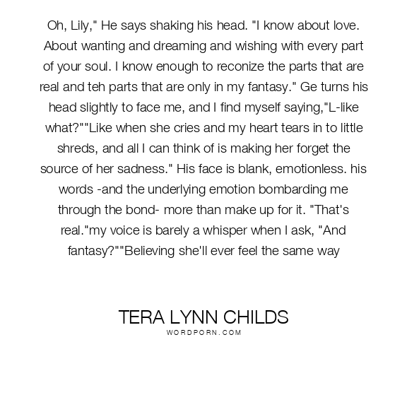 Oh, Lily," He says shaking his head. "I know about love. About wanting and dreaming and wishing with every part of your soul. I know enough to reconize the parts that are real and teh parts that are only in my fantasy." Ge turns his head slightly to face me, and I find myself saying,"L-like what?""Like when she cries and my heart tears in to little shreds, and all I can think of is making her forget the source of her sadness." His face is blank, emotionless. his words -and the underlying emotion bombarding me through the bond- more than make up for it. "That's real."my voice is barely a whisper when I ask, "And fantasy?""Believing she'll ever feel the same way