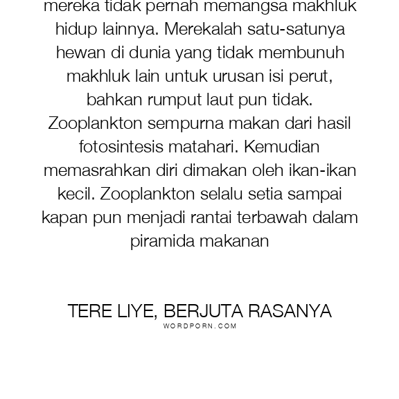 Meski zooplankton itu tergolong hewan, mereka tidak pernah memangsa makhluk hidup lainnya. Merekalah satu-satunya hewan di dunia yang tidak membunuh makhluk lain untuk urusan isi perut, bahkan rumput laut pun tidak. Zooplankton sempurna makan dari hasil fotosintesis matahari. Kemudian memasrahkan diri dimakan oleh ikan-ikan kecil. Zooplankton selalu setia sampai kapan pun menjadi rantai terbawah dalam piramida makanan