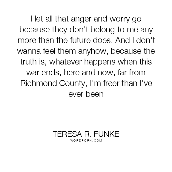 I let all that anger and worry go because they don't belong to me any more than the future does. And I don't wanna feel them anyhow, because the truth is, whatever happens when this war ends, here and now, far from Richmond County, I'm freer than I've ever been