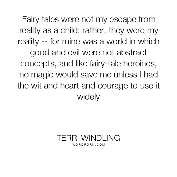 Fairy tales were not my escape from reality as a child; rather, they were my reality -- for mine was a world in which good and evil were not abstract concepts, and like fairy-tale heroines, no magic would save me unless I had the wit and heart and courage to use it widely