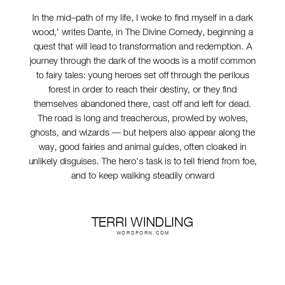In the mid–path of my life, I woke to find myself in a dark wood,' writes Dante, in The Divine Comedy, beginning a quest that will lead to transformation and redemption. A journey through the dark of the woods is a motif common to fairy tales: young heroes set off through the perilous forest in order to reach their destiny, or they find themselves abandoned there, cast off and left for dead. The road is long and treacherous, prowled by wolves, ghosts, and wizards — but helpers also appear along the way, good fairies and animal guides, often cloaked in unlikely disguises. The hero's task is to tell friend from foe, and to keep walking steadily onward