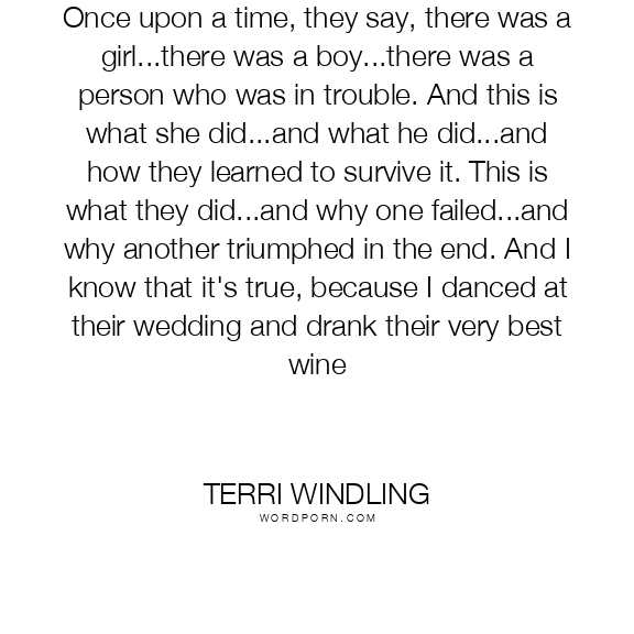 Once upon a time, they say, there was a girl...there was a boy...there was a person who was in trouble. And this is what she did...and what he did...and how they learned to survive it. This is what they did...and why one failed...and why another triumphed in the end. And I know that it's true, because I danced at their wedding and drank their very best wine