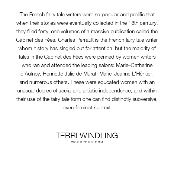 The French fairy tale writers were so popular and prolific that when their stories were eventually collected in the 18th century, they filled forty–one volumes of a massive publication called the Cabinet des Fées. Charles Perrault is the French fairy tale writer whom history has singled out for attention, but the majority of tales in the Cabinet des Fées were penned by women writers who ran and attended the leading salons: Marie–Catherine d’Aulnoy, Henriette Julie de Murat, Marie–Jeanne L'Héritier, and numerous others. These were educated women with an unusual degree of social and artistic independence, and within their use of the fairy tale form one can find distinctly subversive, even feminist subtext