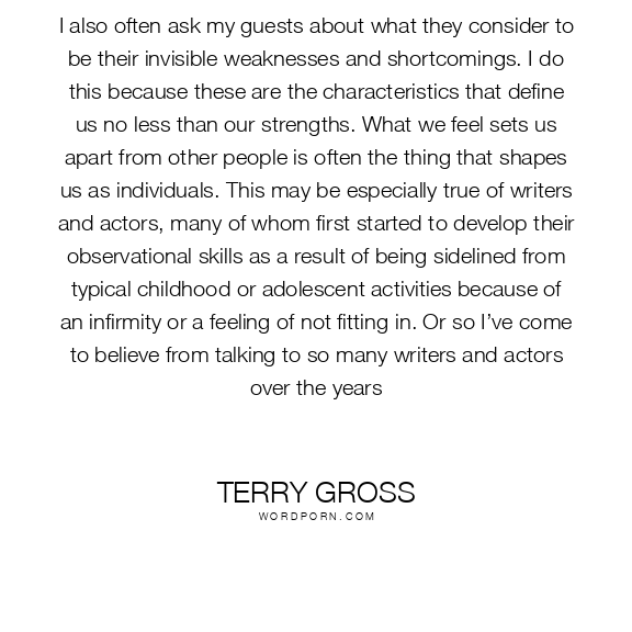 I also often ask my guests about what they consider to be their invisible weaknesses and shortcomings. I do this because these are the characteristics that define us no less than our strengths. What we feel sets us apart from other people is often the thing that shapes us as individuals. This may be especially true of writers and actors, many of whom first started to develop their observational skills as a result of being sidelined from typical childhood or adolescent activities because of an infirmity or a feeling of not fitting in. Or so I’ve come to believe from talking to so many writers and actors over the years