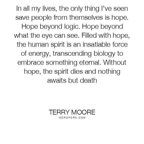 In all my lives, the only thing I've seen save people from themselves is hope. Hope beyond logic. Hope beyond what the eye can see. Filled with hope, the human spirit is an insatiable force of energy, transcending biology to embrace something eternal. Without hope, the spirit dies and nothing awaits but death