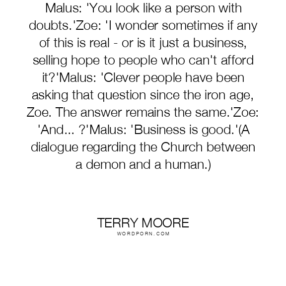 Malus: 'You look like a person with doubts.'Zoe: 'I wonder sometimes if any of this is real - or is it just a business, selling hope to people who can't afford it?'Malus: 'Clever people have been asking that question since the iron age, Zoe. The answer remains the same.'Zoe: 'And... ?'Malus: 'Business is good.'(A dialogue regarding the Church between a demon and a human.)