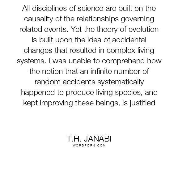 All disciplines of science are built on the causality of the relationships governing related events. Yet the theory of evolution is built upon the idea of accidental changes that resulted in complex living systems. I was unable to comprehend how the notion that an infinite number of random accidents systematically happened to produce living species, and kept improving these beings, is justified