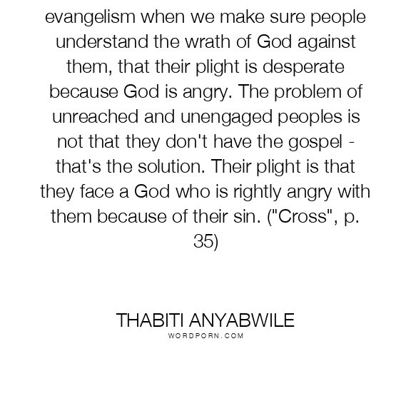 We do some of our best work in evangelism when we make sure people understand the wrath of God against them, that their plight is desperate because God is angry. The problem of unreached and unengaged peoples is not that they don't have the gospel - that's the solution. Their plight is that they face a God who is rightly angry with them because of their sin. ("Cross", p. 35)