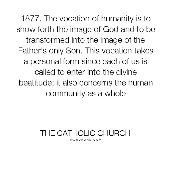 1877. The vocation of humanity is to show forth the image of God and to be transformed into the image of the Father's only Son. This vocation takes a personal form since each of us is called to enter into the divine beatitude; it also concerns the human community as a whole
