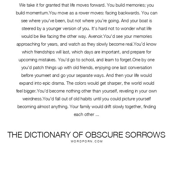 We take it for granted that life moves forward. You build memories; you build momentum.You move as a rower moves: facing backwards. You can see where you've been, but not where you’re going. And your boat is steered by a younger version of you. It's hard not to wonder what life would be like facing the other way. Avenoir.You'd see your memories approaching for years, and watch as they slowly become real.You’d know which friendships will last, which days are important, and prepare for upcoming mistakes. You'd go to school, and learn to forget.One by one you'd patch things up with old friends, enjoying one last conversation before youmeet and go your separate ways. And then your life would expand into epic drama. The colors would get sharper, the world would feel bigger.You'd become nothing other than yourself, reveling in your own weirdness.You'd fall out of old habits until you could picture yourself becoming almost anything. Your family would drift slowly together, finding each other again. You wouldn't have to wonder how much time you had left with people, or how their lives would turn out.You'd know from the start which week was the happiest you’ll ever be, so you could relive it again and again.You'd remember what home feels like,and decide to move there for good. You'd grow smaller as the years pass, as if trying to give away everything you had before leaving.You'd try everything one last time, until it all felt new again. And then the world would finally earn your trust, until you’d think nothing of jumping freely into things, into the arms of other people.You'd start to notice that each summer feels longer than the last.Until you reach the long coasting retirement of childhood.You'd become generous, and give everything back.Pretty soon you’d run out of things to give, things to say, things to see.By then you'll have found someone perfect; and she'll become your world.And you will have left this world just as you found it. Nothing left to remember, nothing left to regret, with your whole life laid out in front of you, and your whole life left behind