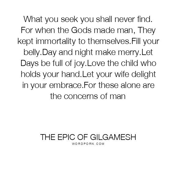 What you seek you shall never find. For when the Gods made man, They kept immortality to themselves.Fill your belly.Day and night make merry.Let Days be full of joy.Love the child who holds your hand.Let your wife delight in your embrace.For these alone are the concerns of man