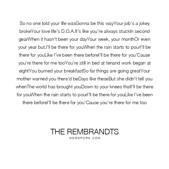 So no one told your life wasGonna be this wayYour job's a jokey brokeYour love life's D.O.A.It's like you're always stuckIn second gearWhen it hasn't been your dayYour week, your monthOr even your year but,I'll be there for youWhen the rain starts to pourI'll be there for youLike I've been there beforeI'll be there for you'Cause you're there for me tooYou're still in bed at tenand work began at eightYou burned your breakfastSo far things are going greatYour mother warned you there'd beDays like theseBut she didn't tell you whenThe world has brought youDown to your knees thatI'll be there for youWhen the rain starts to pourI'll be there for youLike I've been there beforeI'll be there for you'Cause you're there for me too