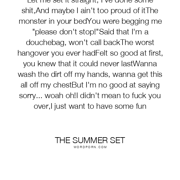 Let me set it straight, I've done some shit,And maybe I ain't too proud of itThe monster in your bedYou were begging me "please don't stop!"Said that I'm a douchebag, won't call backThe worst hangover you ever hadFelt so good at first, you knew that it could never lastWanna wash the dirt off my hands, wanna get this all off my chestBut I'm no good at saying sorry... woah oh!I didn't mean to fuck you over,I just want to have some fun