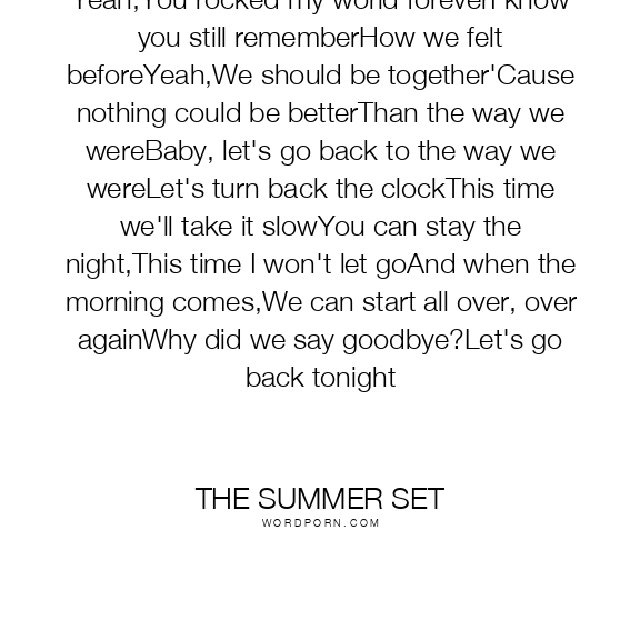 Yeah,You rocked my world foreverI know you still rememberHow we felt beforeYeah,We should be together'Cause nothing could be betterThan the way we wereBaby, let's go back to the way we wereLet's turn back the clockThis time we'll take it slowYou can stay the night,This time I won't let goAnd when the morning comes,We can start all over, over againWhy did we say goodbye?Let's go back tonight