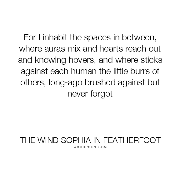 For I inhabit the spaces in between, where auras mix and hearts reach out and knowing hovers, and where sticks against each human the little burrs of others, long-ago brushed against but never forgot