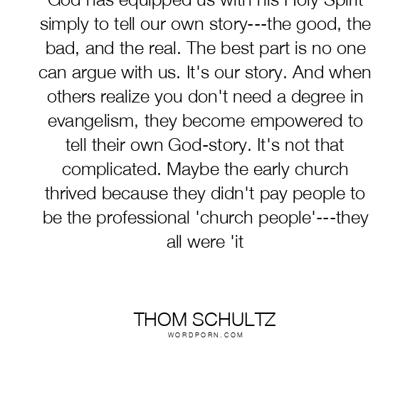 God has equipped us with his Holy Spirit simply to tell our own story---the good, the bad, and the real. The best part is no one can argue with us. It's our story. And when others realize you don't need a degree in evangelism, they become empowered to tell their own God-story. It's not that complicated. Maybe the early church thrived because they didn't pay people to be the professional 'church people'---they all were 'it