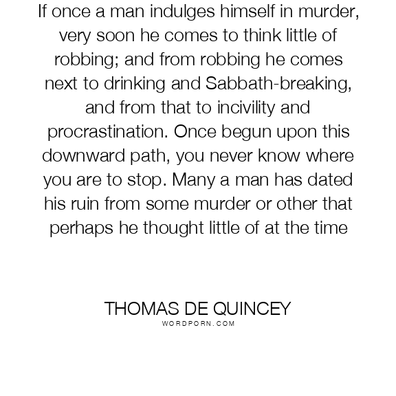If once a man indulges himself in murder, very soon he comes to think little of robbing; and from robbing he comes next to drinking and Sabbath-breaking, and from that to incivility and procrastination. Once begun upon this downward path, you never know where you are to stop. Many a man has dated his ruin from some murder or other that perhaps he thought little of at the time
