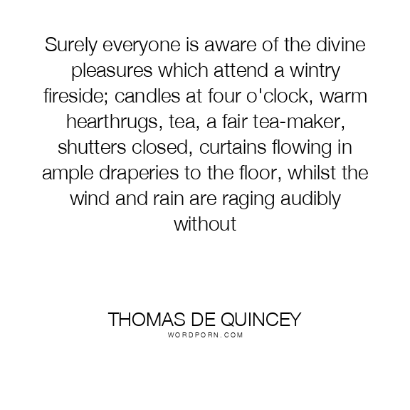Surely everyone is aware of the divine pleasures which attend a wintry fireside; candles at four o'clock, warm hearthrugs, tea, a fair tea-maker, shutters closed, curtains flowing in ample draperies to the floor, whilst the wind and rain are raging audibly without