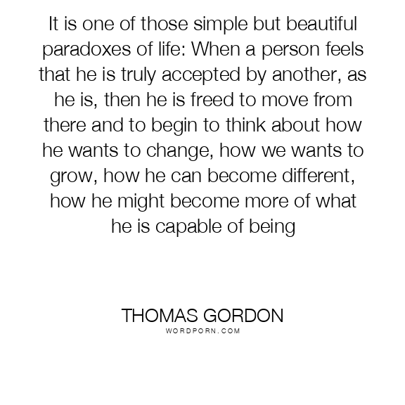 Thomas Gordon quote. It is one of those simple but beautiful paradoxes of life: When a person feels that he is truly accepted by another, as he is, then he is freed to move from there and to begin to think about how he wants to change, how we wants to grow, how he can become different, how he might become more of what he is capable of being