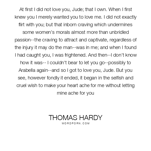 At first I did not love you, Jude; that I own. When I first knew you I merely wanted you to love me. I did not exactly flirt with you; but that inborn craving which undermines some women's morals almost more than unbridled passion--the craving to attract and captivate, regardless of the injury it may do the man--was in me; and when I found I had caught you, I was frightened. And then--I don't know how it was-- I couldn't bear to let you go--possibly to Arabella again--and so I got to love you, Jude. But you see, however fondly it ended, it began in the selfish and cruel wish to make your heart ache for me without letting mine ache for you