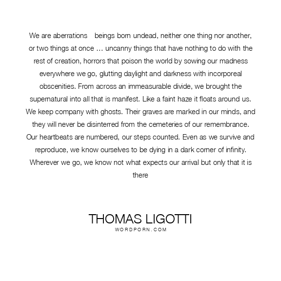 We are aberrations—beings born undead, neither one thing nor another, or two things at once … uncanny things that have nothing to do with the rest of creation, horrors that poison the world by sowing our madness everywhere we go, glutting daylight and darkness with incorporeal obscenities. From across an immeasurable divide, we brought the supernatural into all that is manifest. Like a faint haze it floats around us. We keep company with ghosts. Their graves are marked in our minds, and they will never be disinterred from the cemeteries of our remembrance. Our heartbeats are numbered, our steps counted. Even as we survive and reproduce, we know ourselves to be dying in a dark corner of infinity. Wherever we go, we know not what expects our arrival but only that it is there