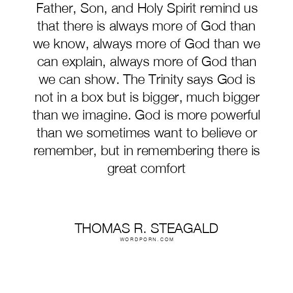 Father, Son, and Holy Spirit remind us that there is always more of God than we know, always more of God than we can explain, always more of God than we can show. The Trinity says God is not in a box but is bigger, much bigger than we imagine. God is more powerful than we sometimes want to believe or remember, but in remembering there is great comfort