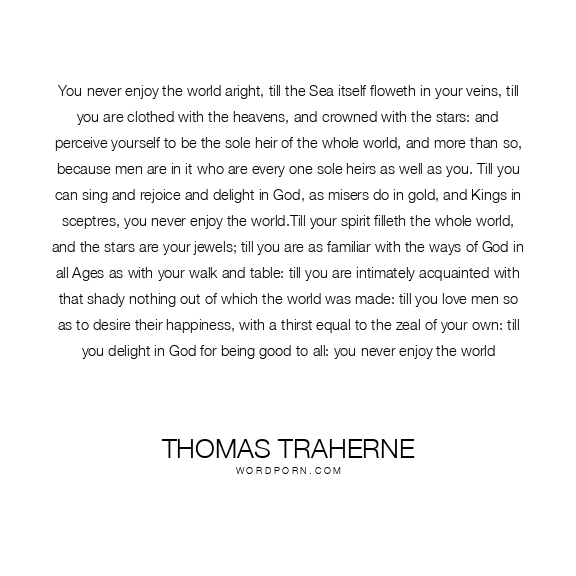 You never enjoy the world aright, till the Sea itself floweth in your veins, till you are clothed with the heavens, and crowned with the stars: and perceive yourself to be the sole heir of the whole world, and more than so, because men are in it who are every one sole heirs as well as you. Till you can sing and rejoice and delight in God, as misers do in gold, and Kings in sceptres, you never enjoy the world.Till your spirit filleth the whole world, and the stars are your jewels; till you are as familiar with the ways of God in all Ages as with your walk and table: till you are intimately acquainted with that shady nothing out of which the world was made: till you love men so as to desire their happiness, with a thirst equal to the zeal of your own: till you delight in God for being good to all: you never enjoy the world