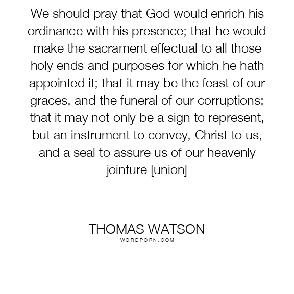 We should pray that God would enrich his ordinance with his presence; that he would make the sacrament effectual to all those holy ends and purposes for which he hath appointed it; that it may be the feast of our graces, and the funeral of our corruptions; that it may not only be a sign to represent, but an instrument to convey, Christ to us, and a seal to assure us of our heavenly jointure [union]