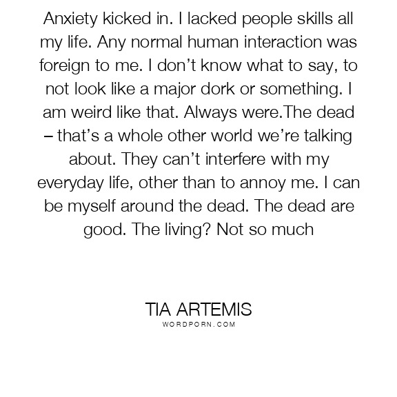 Anxiety kicked in. I lacked people skills all my life. Any normal human interaction was foreign to me. I don’t know what to say, to not look like a major dork or something. I am weird like that. Always were.The dead – that’s a whole other world we’re talking about. They can’t interfere with my everyday life, other than to annoy me. I can be myself around the dead. The dead are good. The living? Not so much