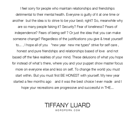 I feel sorry for people who maintain relationships and friendships detrimental to their mental health. Everyone is guilty of it at one time or another- but the idea is to strive to be your best; right? So, meanwhile why are so many people faking it? Security? Fear of loneliness? Fears of independence? Fears of being self ? Or just the idea that you can make someone change? Regardless of the justifications you give & treat yourself to... , I hope all of you - "new year -new me types" strive for self care , honest and pure friendships and relationships based of love- and not based off the fake realities of your mind. These delusions of what you hope for instead of what's there, where you and your puppet show master focus more on everyone else and less on self. To change the world you must start within. But you must first BE HONEST with yourself. My new year started a few months ago-- and it was the best choice I ever made- and I hope your recreations are progressive and successful in THE NEW YEAR