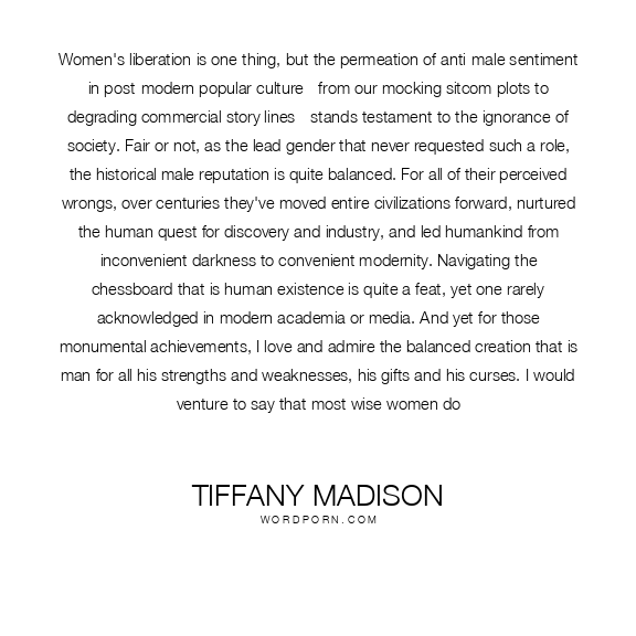 Women's liberation is one thing, but the permeation of anti-male sentiment in post-modern popular culture - from our mocking sitcom plots to degrading commercial story lines - stands testament to the ignorance of society. Fair or not, as the lead gender that never requested such a role, the historical male reputation is quite balanced. For all of their perceived wrongs, over centuries they've moved entire civilizations forward, nurtured the human quest for discovery and industry, and led humankind from inconvenient darkness to convenient modernity. Navigating the chessboard that is human existence is quite a feat, yet one rarely acknowledged in modern academia or media. And yet for those monumental achievements, I love and admire the balanced creation that is man for all his strengths and weaknesses, his gifts and his curses. I would venture to say that most wise women do