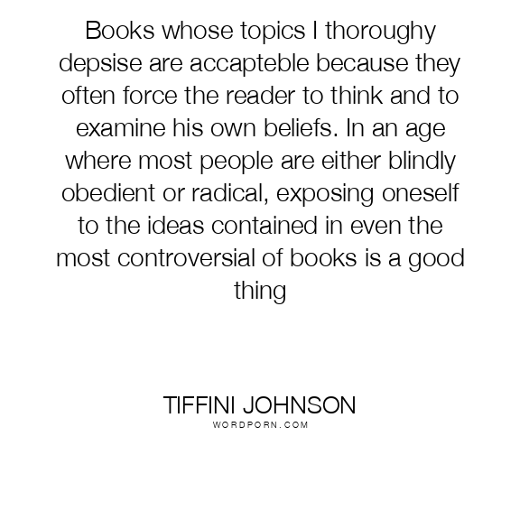 Books whose topics I thoroughy depsise are accapteble because they often force the reader to think and to examine his own beliefs. In an age where most people are either blindly obedient or radical, exposing oneself to the ideas contained in even the most controversial of books is a good thing