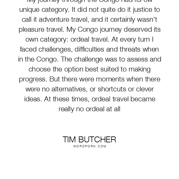My journey through the Congo had its ow unique category. It did not quite do it justice to call it adventure travel, and it certainly wasn't pleasure travel. My Congo journey deserved its own category: ordeal travel. At every turn I faced challenges, difficulties and threats when in the Congo. The challenge was to assess and choose the option best suited to making progress. But there were moments when there were no alternatives, or shortcuts or clever ideas. At these times, ordeal travel became really no ordeal at all