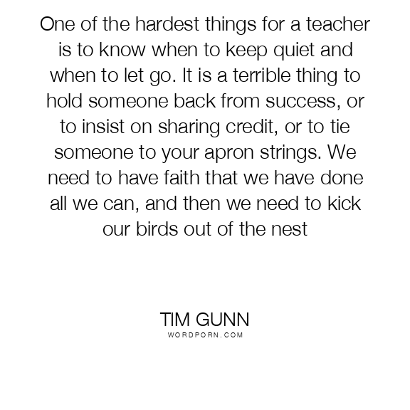 Tim Gunn quote. One of the hardest things for a teacher is to know when to keep quiet and when to let go. It is a terrible thing to hold someone back from success, or to insist on sharing credit, or to tie someone to your apron strings. We need to have faith that we have done all we can, and then we need to kick our birds out of the nest