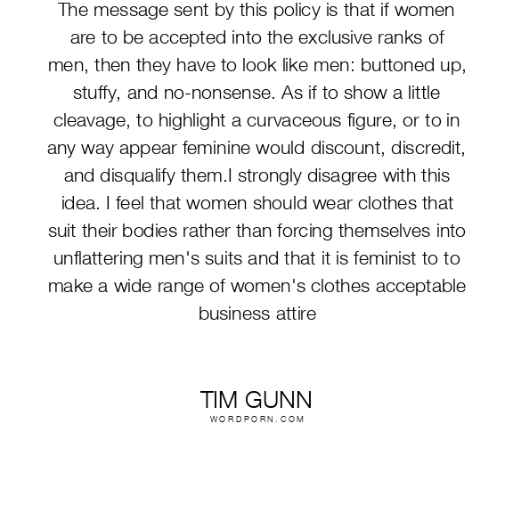 Tim Gunn quote. The message sent by this policy is that if women are to be accepted into the exclusive ranks of men, then they have to look like men: buttoned up, stuffy, and no-nonsense. As if to show a little cleavage, to highlight a curvaceous figure, or to in any way appear feminine would discount, discredit, and disqualify them.I strongly disagree with this idea. I feel that women should wear clothes that suit their bodies rather than forcing themselves into unflattering men's suits and that it is feminist to to make a wide range of women's clothes acceptable business attire