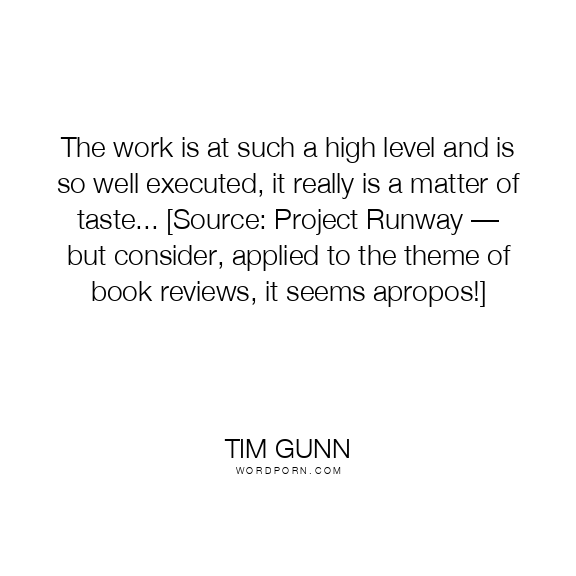 Tim Gunn quote. The work is at such a high level and is so well executed, it really is a matter of taste... [Source: Project Runway — but consider, applied to the theme of book reviews, it seems apropos!]