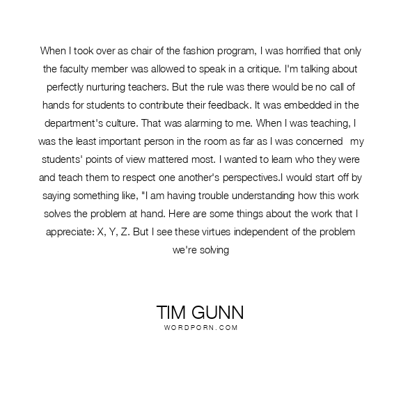 Tim Gunn quote. When I took over as chair of the fashion program, I was horrified that only the faculty member was allowed to speak in a critique. I'm talking about perfectly nurturing teachers. But the rule was there would be no call of hands for students to contribute their feedback. It was embedded in the department's culture. That was alarming to me. When I was teaching, I was the least important person in the room as far as I was concerned--my students' points of view mattered most. I wanted to learn who they were and teach them to respect one another's perspectives.I would start off by saying something like,