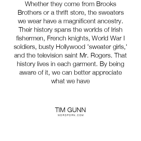 Tim Gunn quote. Whether they come from Brooks Brothers or a thrift store, the sweaters we wear have a magnificent ancestry. Their history spans the worlds of Irish fishermen, French knights, World War I soldiers, busty Hollywood 'sweater girls,' and the television saint Mr. Rogers. That history lives in each garment. By being aware of it, we can better appreciate what we have