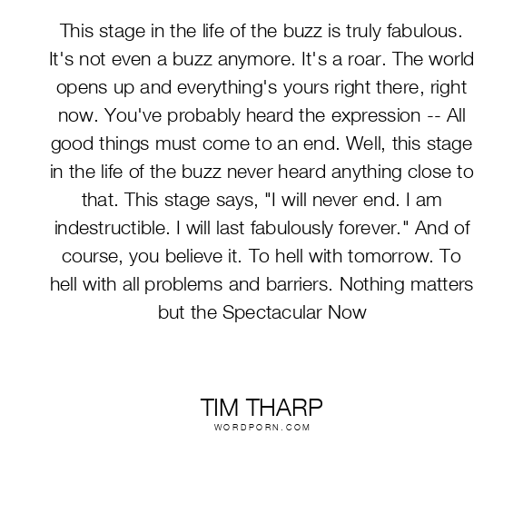 This stage in the life of the buzz is truly fabulous. It's not even a buzz anymore. It's a roar. The world opens up and everything's yours right there, right now. You've probably heard the expression -- All good things must come to an end. Well, this stage in the life of the buzz never heard anything close to that. This stage says, "I will never end. I am indestructible. I will last fabulously forever." And of course, you believe it. To hell with tomorrow. To hell with all problems and barriers. Nothing matters but the Spectacular Now