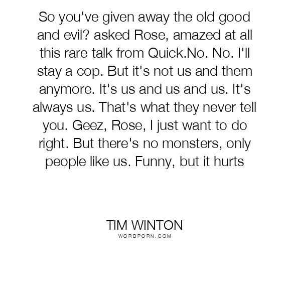 So you've given away the old good and evil? asked Rose, amazed at all this rare talk from Quick.No. No. I'll stay a cop. But it's not us and them anymore. It's us and us and us. It's always us. That's what they never tell you. Geez, Rose, I just want to do right. But there's no monsters, only people like us. Funny, but it hurts