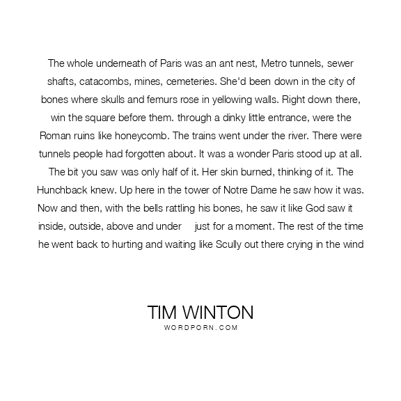 The whole underneath of Paris was an ant nest, Metro tunnels, sewer shafts, catacombs, mines, cemeteries. She'd been down in the city of bones where skulls and femurs rose in yellowing walls. Right down there, win the square before them. through a dinky little entrance, were the Roman ruins like honeycomb. The trains went under the river. There were tunnels people had forgotten about. It was a wonder Paris stood up at all. The bit you saw was only half of it. Her skin burned, thinking of it. The Hunchback knew. Up here in the tower of Notre Dame he saw how it was. Now and then, with the bells rattling his bones, he saw it like God saw it -- inside, outside, above and under -- just for a moment. The rest of the time he went back to hurting and waiting like Scully out there crying in the wind
