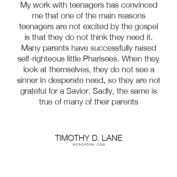 My work with teenagers has convinced me that one of the main reasons teenagers are not excited by the gospel is that they do not think they need it. Many parents have successfully raised self-righteous little Pharisees. When they look at themselves, they do not see a sinner in desperate need, so they are not grateful for a Savior. Sadly, the same is true of many of their parents