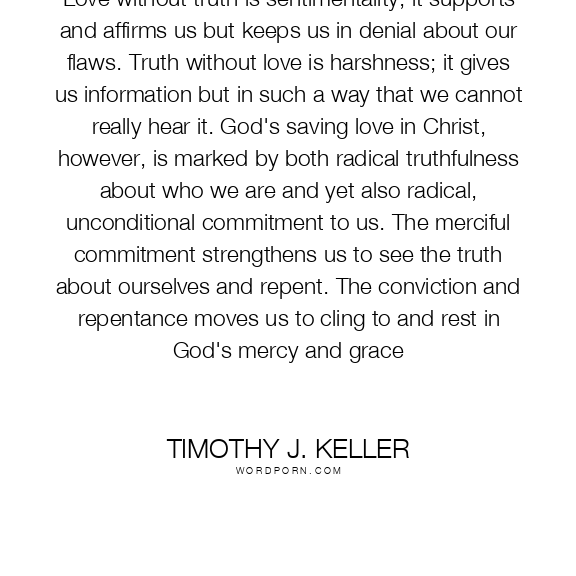 Love without truth is sentimentality; it supports and affirms us but keeps us in denial about our flaws. Truth without love is harshness; it gives us information but in such a way that we cannot really hear it. God's saving love in Christ, however, is marked by both radical truthfulness about who we are and yet also radical, unconditional commitment to us. The merciful commitment strengthens us to see the truth about ourselves and repent. The conviction and repentance moves us to cling to and rest in God's mercy and grace