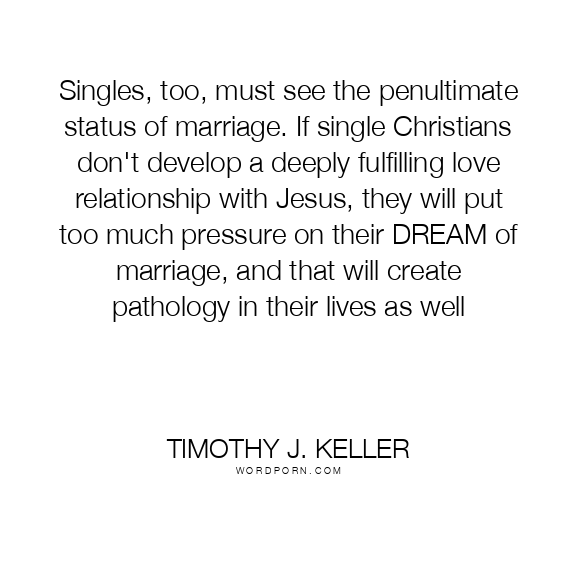 Singles, too, must see the penultimate status of marriage. If single Christians don't develop a deeply fulfilling love relationship with Jesus, they will put too much pressure on their DREAM of marriage, and that will create pathology in their lives as well