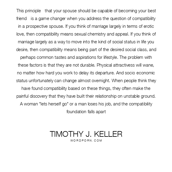 This principle - that your spouse should be capable of becoming your best friend - is a game changer when you address the question of compatibility in a prospective spouse. If you think of marriage largely in terms of erotic love, then compatibility means sexual chemistry and appeal. If you think of marriage largely as a way to move into the kind of social status in life you desire, then compatibility means being part of the desired social class, and perhaps common tastes and aspirations for lifestyle. The problem with these factors is that they are not durable. Physical attractivess will wane, no matter how hard you work to delay its departure. And socio-economic status unfortunately can change almost overnight. When people think they have found compatibility based on these things, they often make the painful discovery that they have built their relationship on unstable ground. A woman "lets herself go" or a man loses his job, and the compatibility foundation falls apart