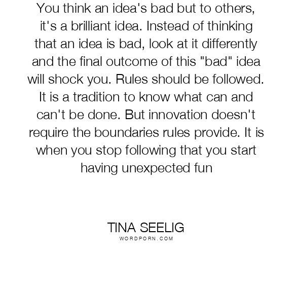 You think an idea's bad but to others, it's a brilliant idea. Instead of thinking that an idea is bad, look at it differently and the final outcome of this "bad" idea will shock you. Rules should be followed. It is a tradition to know what can and can't be done. But innovation doesn't require the boundaries rules provide. It is when you stop following that you start having unexpected fun
