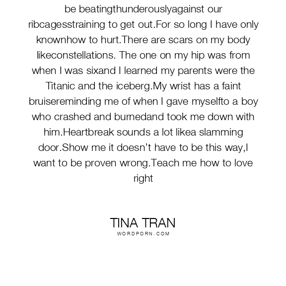 Teach me how to love you so goodour hearts will be beatingthunderouslyagainst our ribcagesstraining to get out.For so long I have only knownhow to hurt.There are scars on my body likeconstellations. The one on my hip was from when I was sixand I learned my parents were the Titanic and the iceberg.My wrist has a faint bruisereminding me of when I gave myselfto a boy who crashed and burnedand took me down with him.Heartbreak sounds a lot likea slamming door.Show me it doesn’t have to be this way,I want to be proven wrong.Teach me how to love right