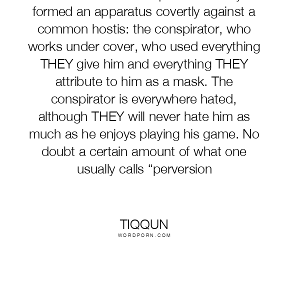 Domination and critique have always formed an apparatus covertly against a common hostis: the conspirator, who works under cover, who used everything THEY give him and everything THEY attribute to him as a mask. The conspirator is everywhere hated, although THEY will never hate him as much as he enjoys playing his game. No doubt a certain amount of what one usually calls “perversion