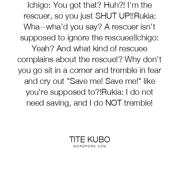 Ichigo: You got that? Huh?! I'm the rescuer, so you just SHUT UP!!Rukia: Wha--wha'd you say? A rescuer isn't supposed to ignore the rescuee!Ichigo: Yeah? And what kind of rescuee complains about the rescue!? Why don't you go sit in a corner and tremble in fear and cry out "Save me! Save me!" like you're supposed to?!Rukia: I do not need saving, and I do NOT tremble!