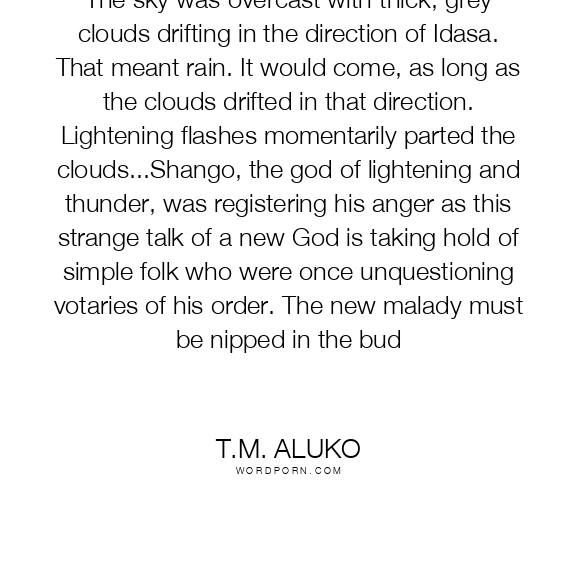 The sky was overcast with thick, grey clouds drifting in the direction of Idasa. That meant rain. It would come, as long as the clouds drifted in that direction. Lightening flashes momentarily parted the clouds...Shango, the god of lightening and thunder, was registering his anger as this strange talk of a new God is taking hold of simple folk who were once unquestioning votaries of his order. The new malady must be nipped in the bud